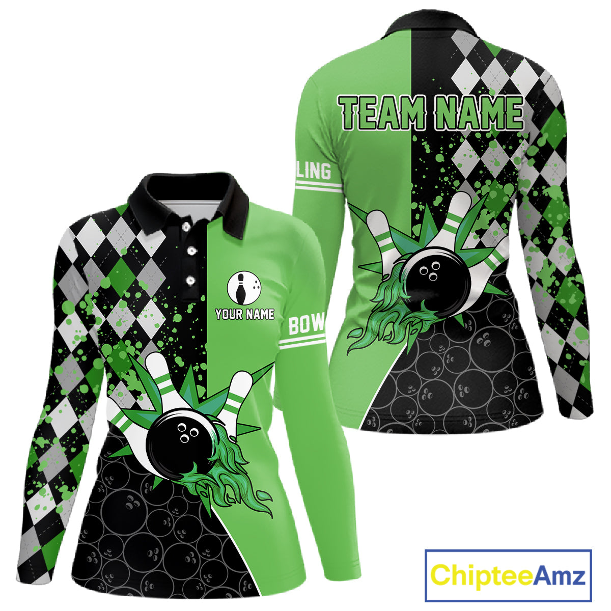 Custom Black and Green argyle pattern flame Bowling Team Jersey Bowling Polo, 1/4 Zip Shirt for Women NQS10450