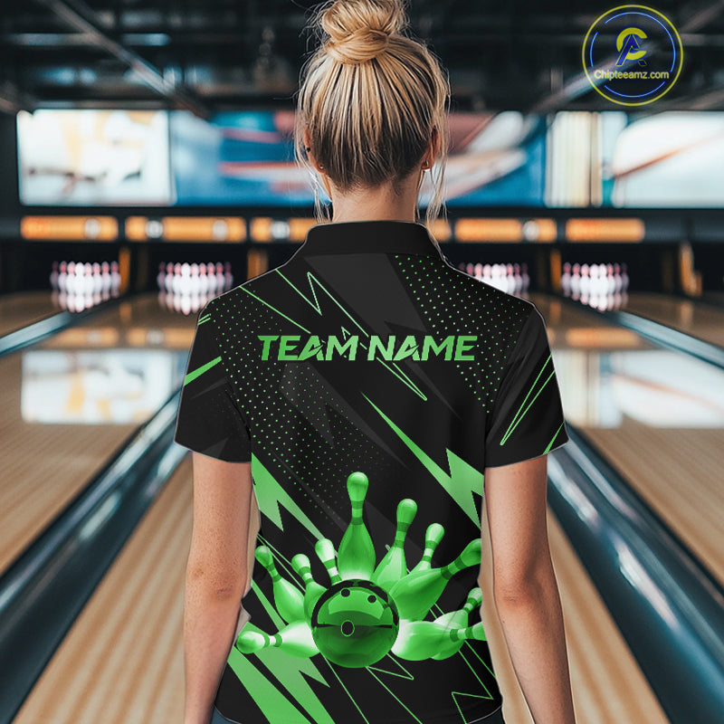Custom Black and Green Bowling Polo, Quarter Zip Shirts for Women, Team Bowling League Jersey NQS10893