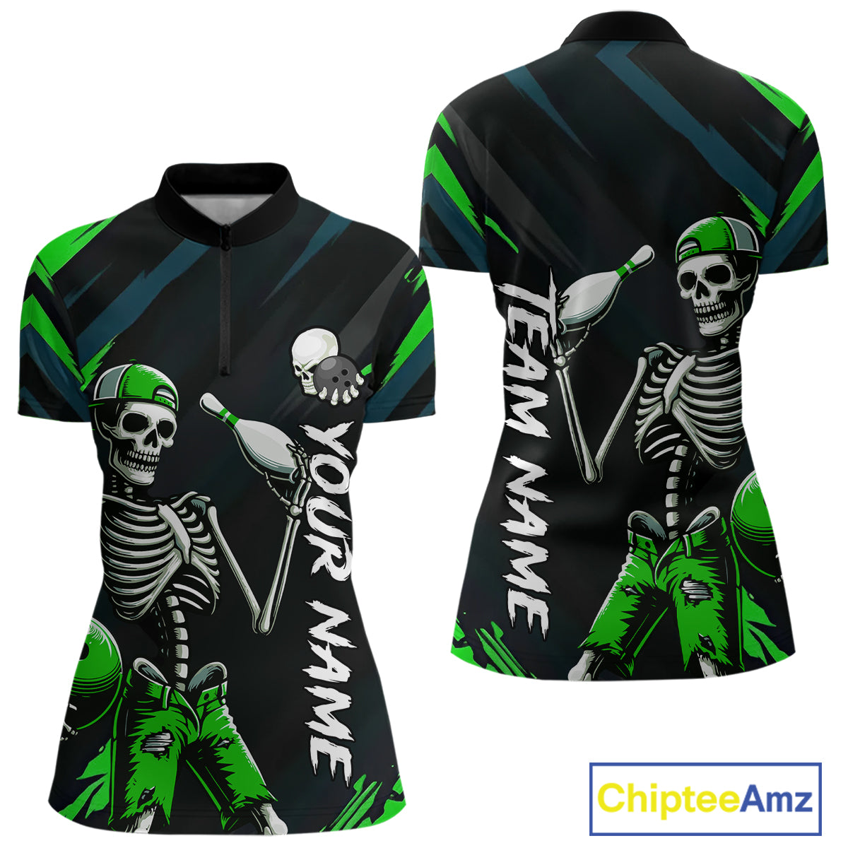 Custom Green Skull Bowling Team Shirt for Women Polo & 1/4 Zip Bowling League Jersey Bowling Gift QZT794