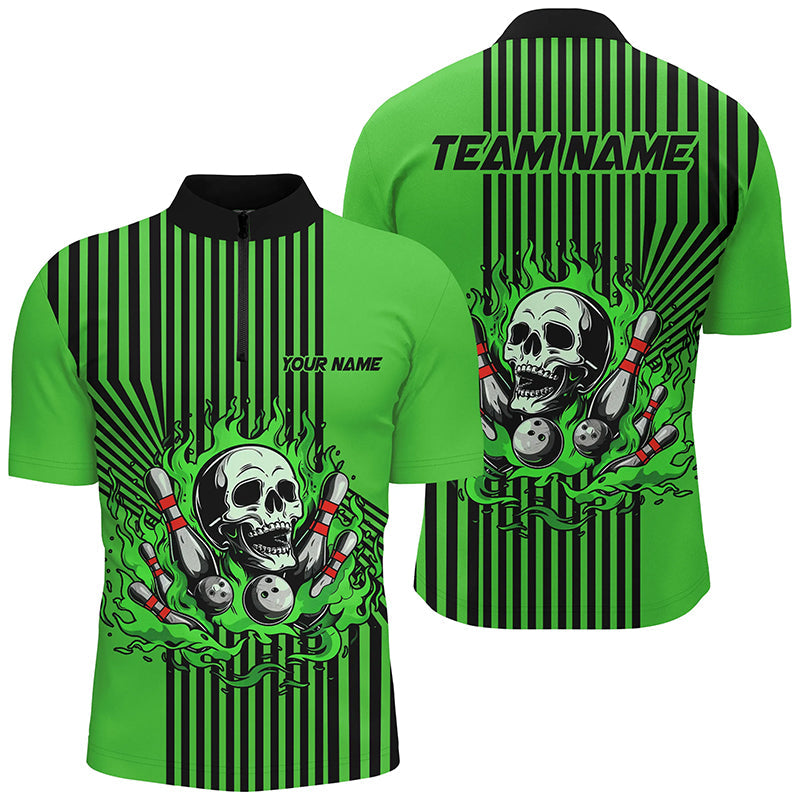 Green and Black stripes Mens bowling polo, quarter zip shirts Custom Skull bowling Team Jerseys NQS7648