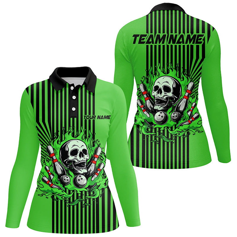 Green and Black stripes Women bowling polo, quarter zip shirts Custom Skull bowling Team Jerseys NQS7648