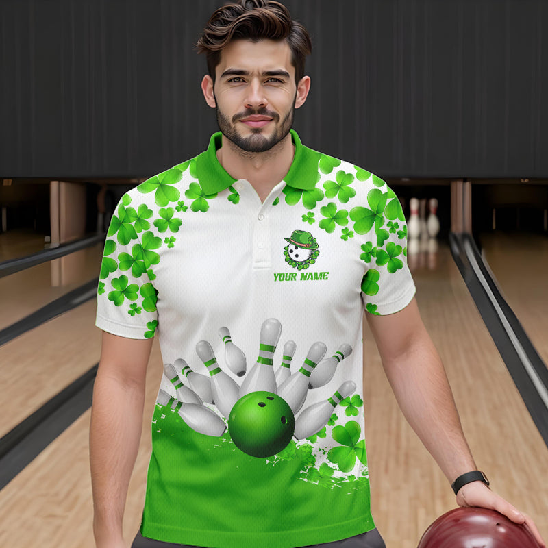 Green and White Shamrock pattern Bowling Shirts For Men Custom St Patrick Day Bowling Team Jerseys NQS9496