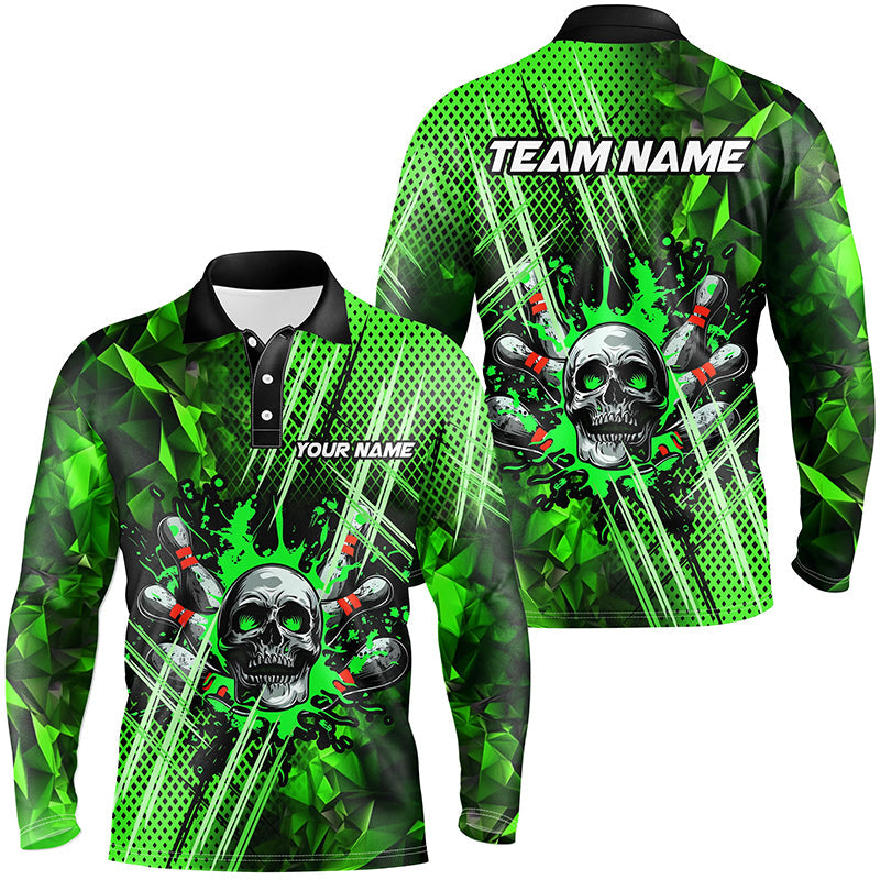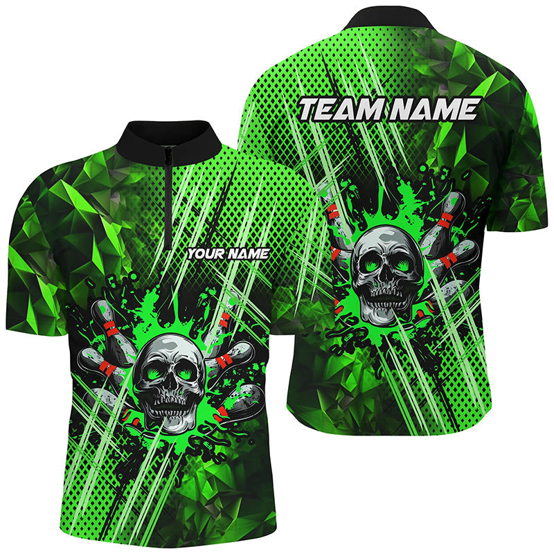 Green bowling pattern skull Men bowling Polo, Quarter Zip shirts Custom Bowling Team League Jerseys NQS7751