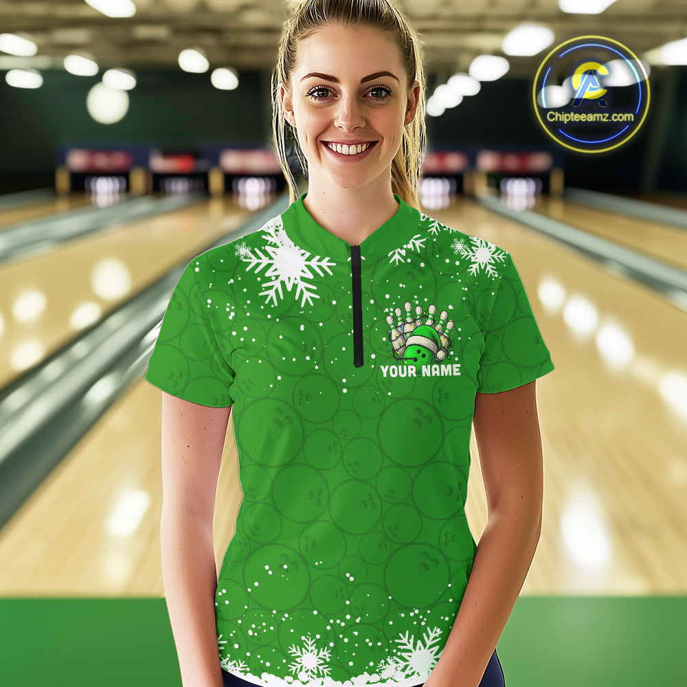 Green Christmas Bowling snowflake Women's Bowling Polo, Quarter Zip shirt Custom Xmas Bowling Outfits NQS10996