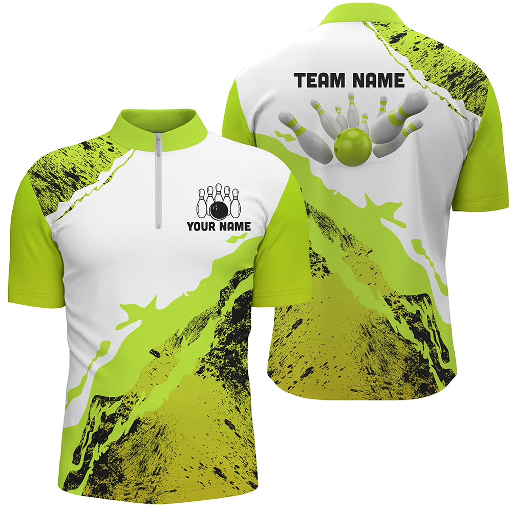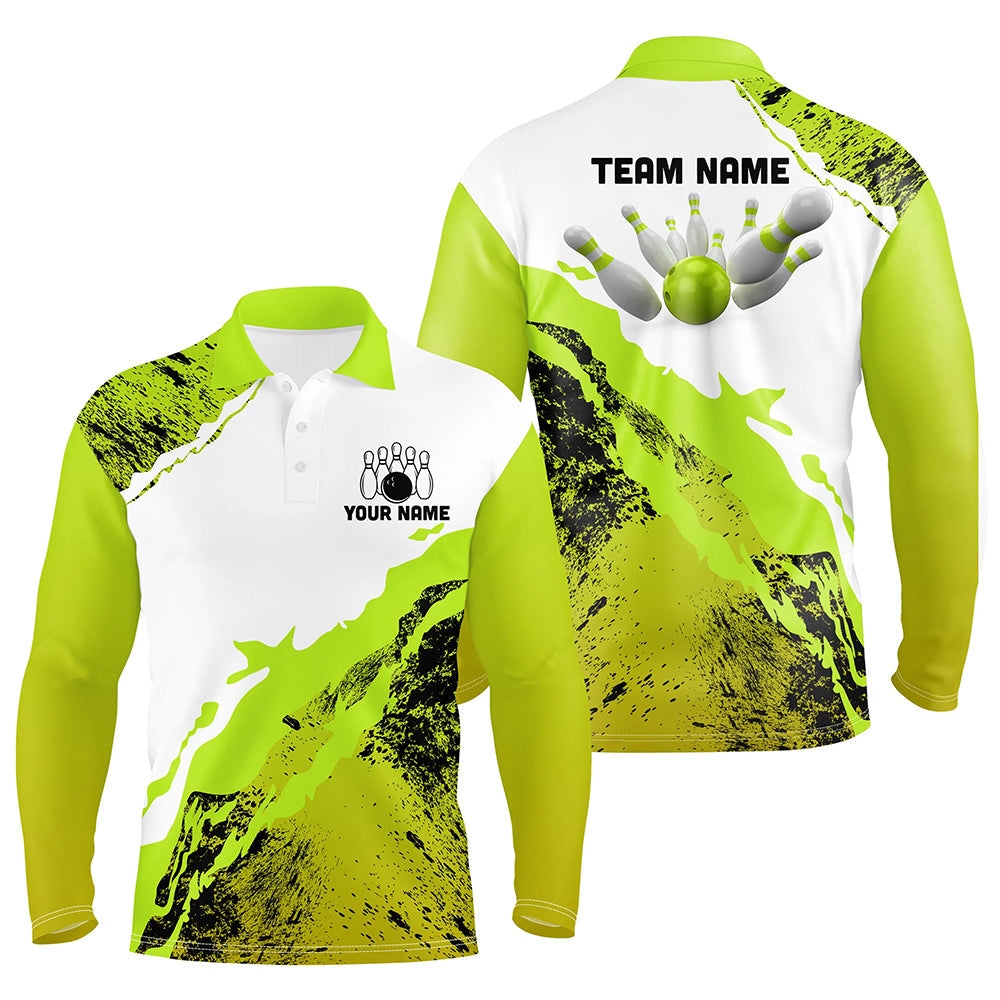 Green grunge Mens Bowling shirts Custom Bowling ball and pins Team league Jerseys, gifts for bowlers NQS8945