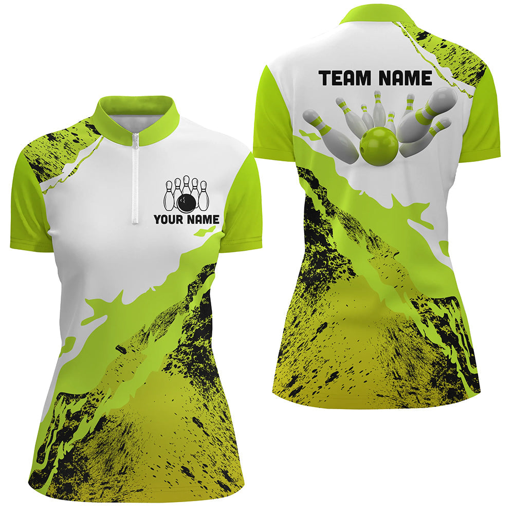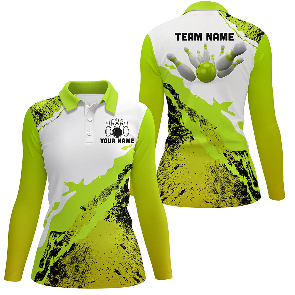 Green grunge Women Bowling shirts Custom Bowling ball and pins Team league Jerseys, gifts for bowlers NQS8945