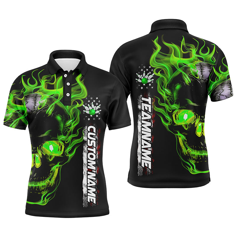 Custom Green Flame Skull Bowling Team Shirts, Bowling Polo/ Quarter-Zip Shirts For Men And Women IPHW6098