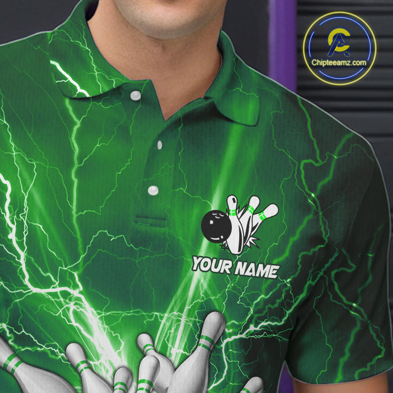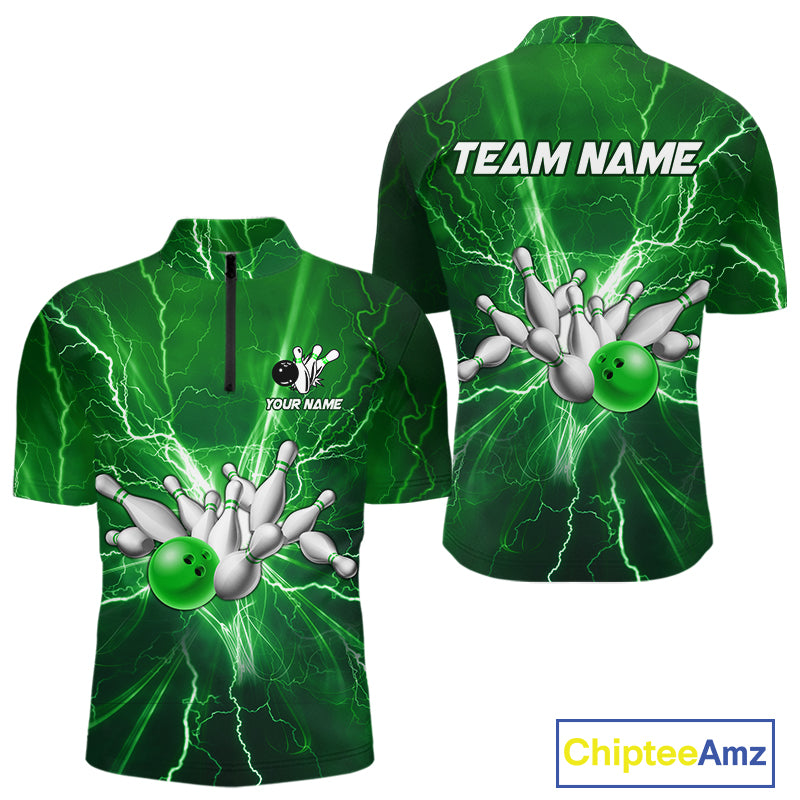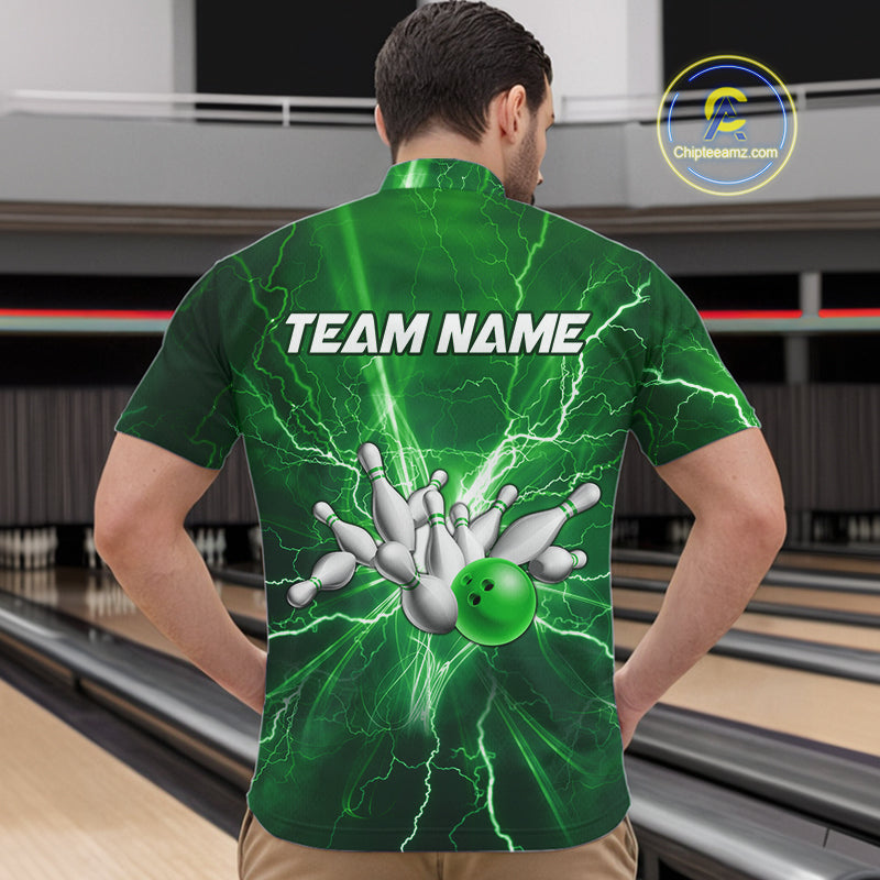 Men's Bowling Shirts Custom Green Lightning Thunder Bowling Team Jersey, gift for team Bowlers NQS10602