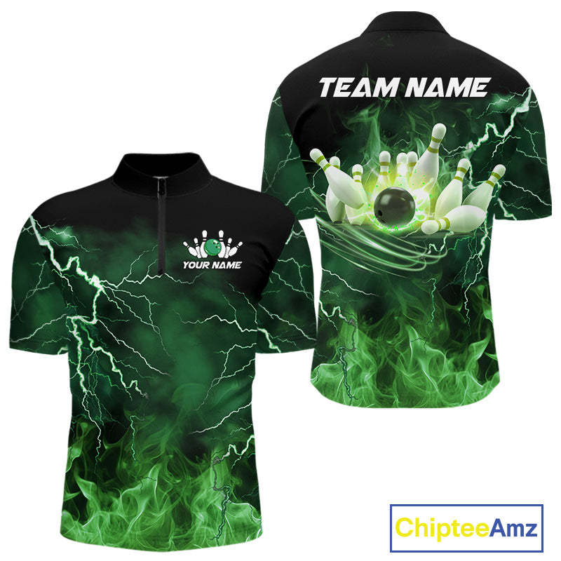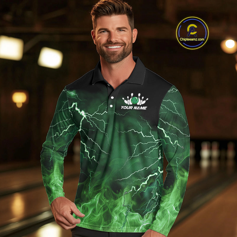 Mens bowling shirts Custom green lightning thunder flame Bowling Team Jersey, gift for team Bowlers NQS10388