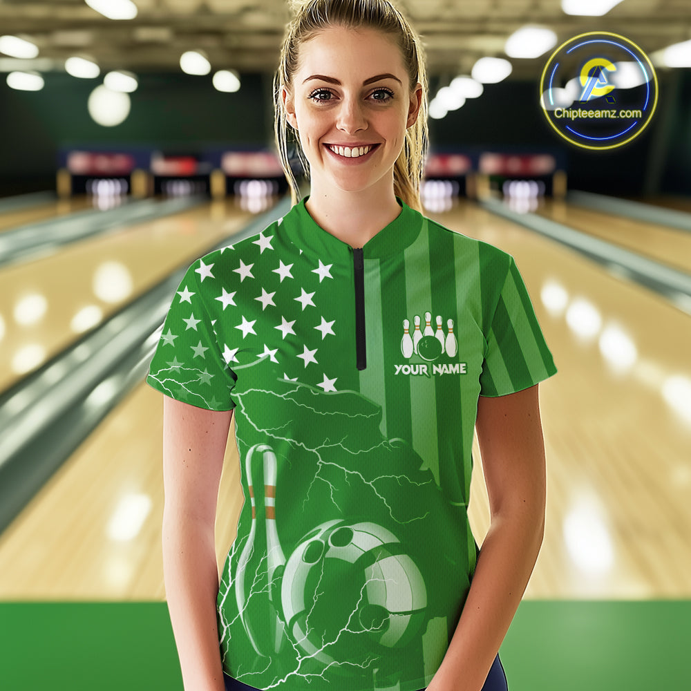 Personalized Green American flag Lightning thunder Custom Bowling Team Shirt For Women Bowling Jersey NQS10487