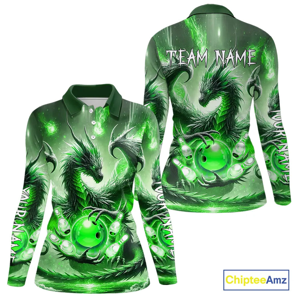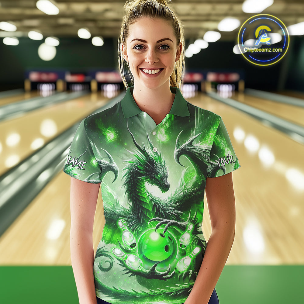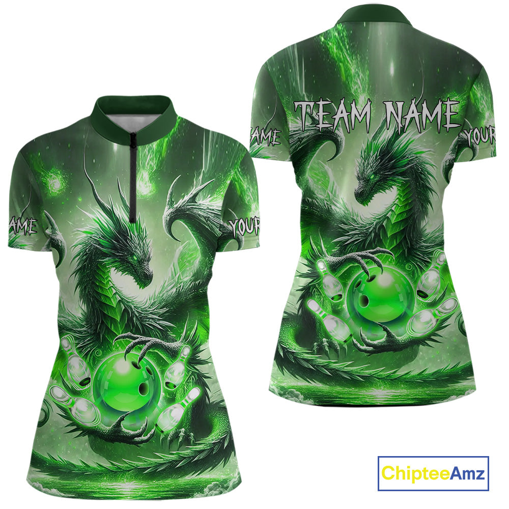 Personalized Green Lights Dragon Women Bowling Polo, 1/4 Zip Shirt Custom Team Bowling League Jersey NQS10199