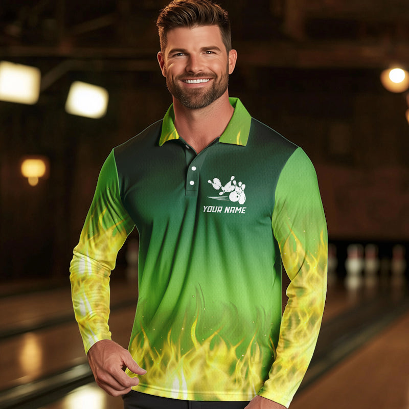 Personalized Yellow Green Flame Bowling Polo, Quarter Zip Shirts For Men Custom Team Bowling Jersey NQS9559