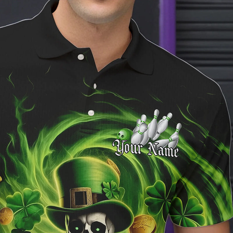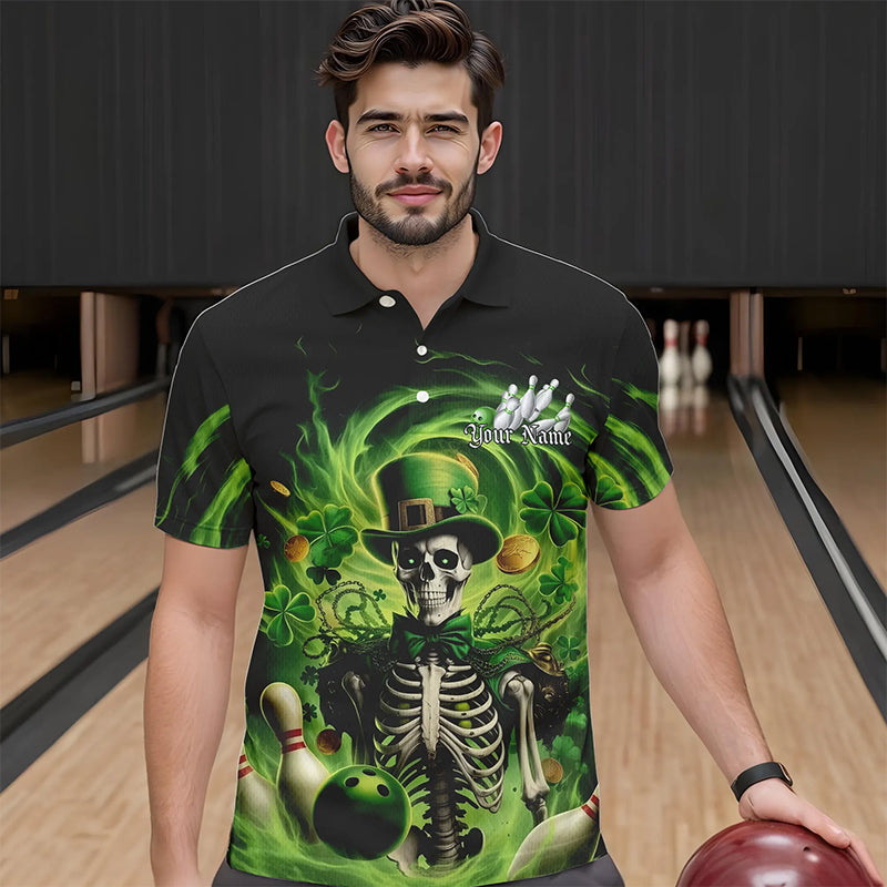 Custom Green St Patricks Day Skull Bowling Polo Shirts For Men, Shamrock Bowling Shirt IPHW8376