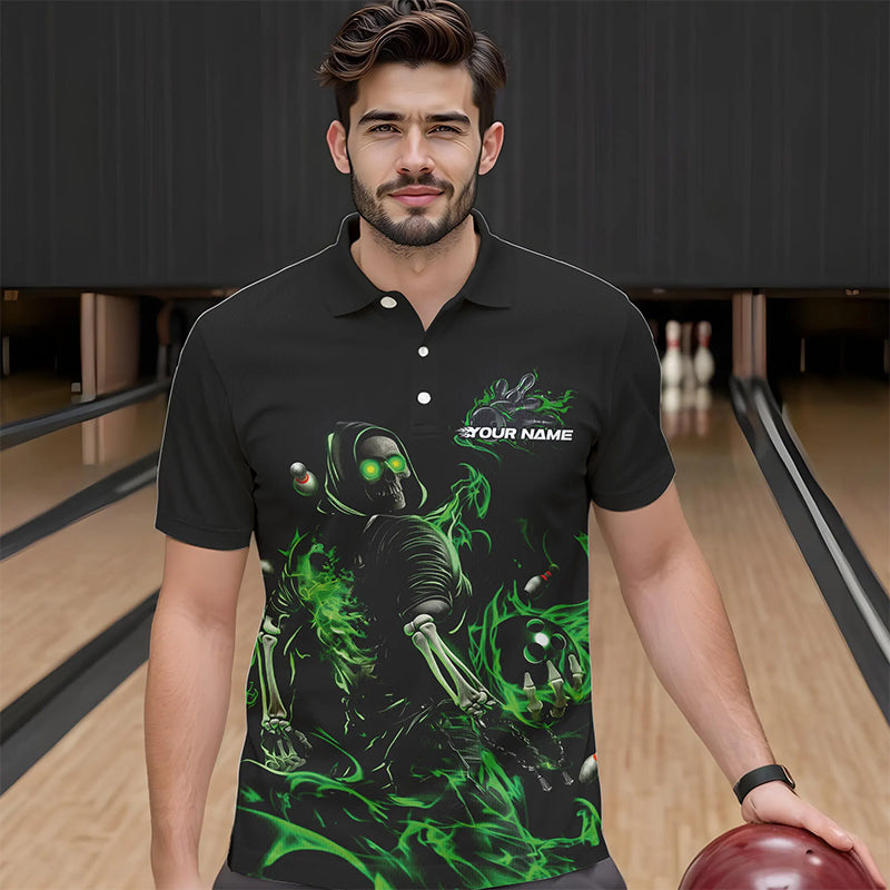 Custom Black And Green Flame Skeleton Bowling Polo Shirts For Men, Skull Bowling Jerseys IPHW8413