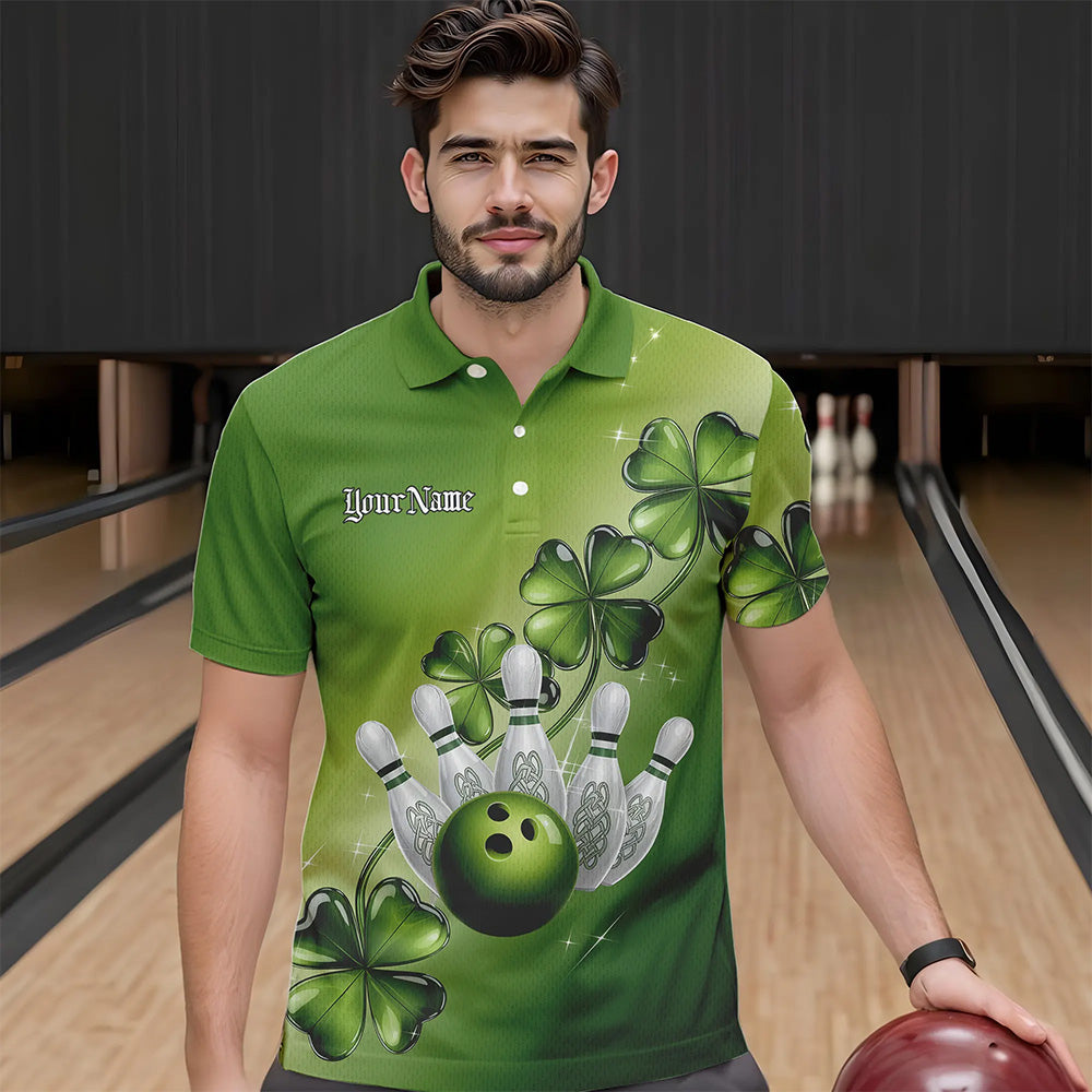 Custom Green Shamprock Saint Patricks Bowling Polo Shirts For Men, Lucky Bowling Team Shirt IPHW8578