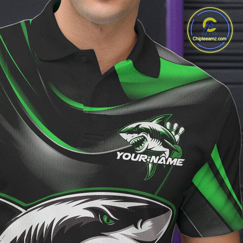 Custom Black And Green Shark Bowling Team Polo Shirts For Men, Bowling League Shirt IPHW9004
