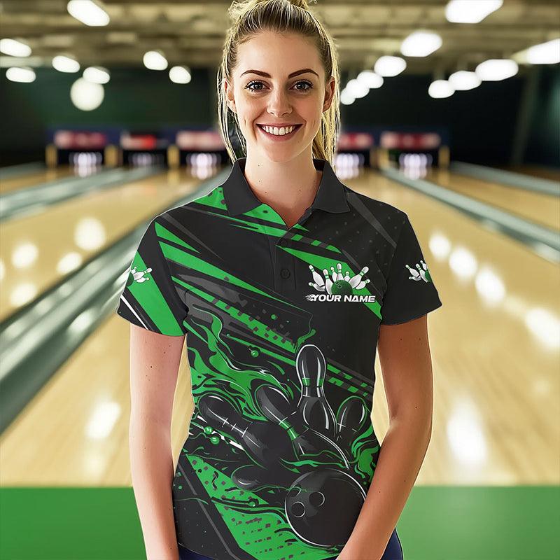 Custom Black And Green Flame Women Bowling Polo Shirt, Fire Bowling Ball Bowling Team Shirt IPHW8699