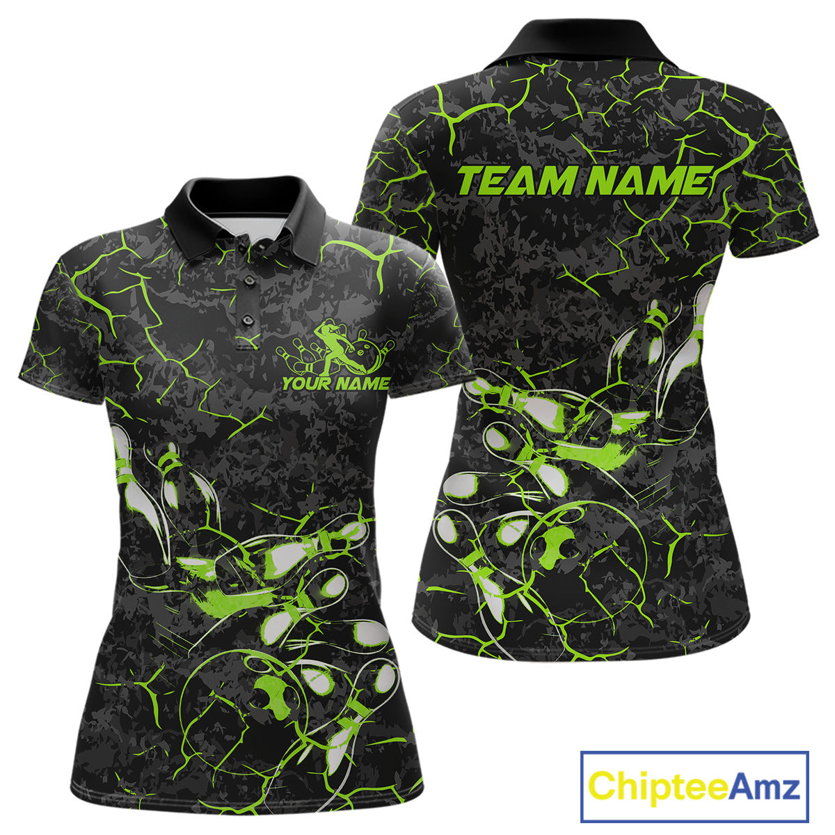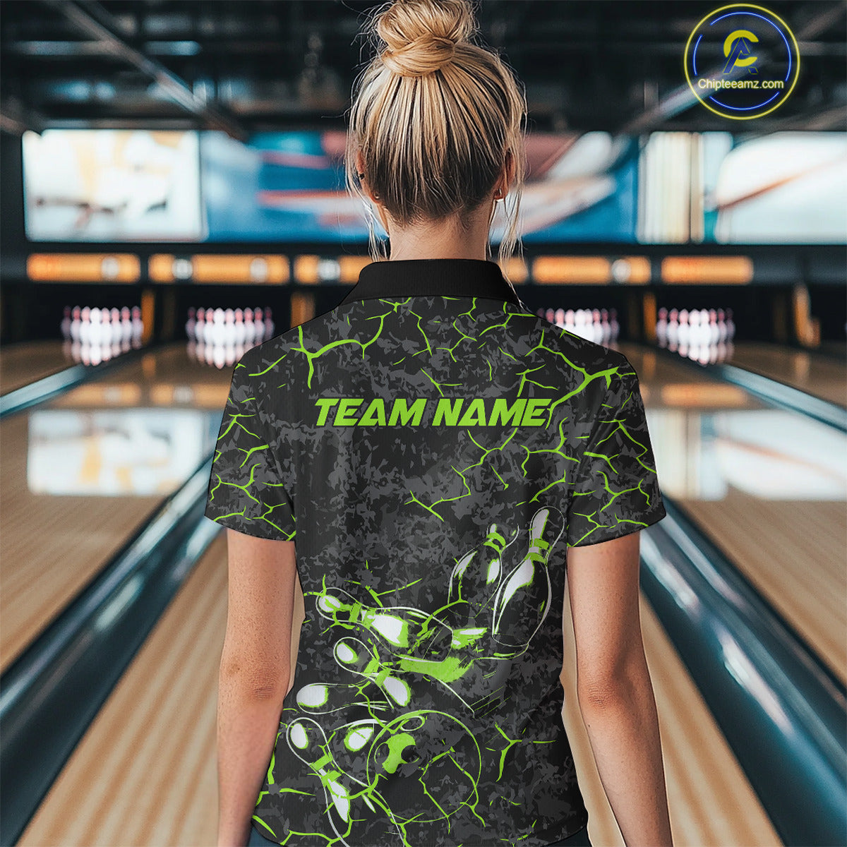 Custom Black And Green Camo Bowling Team Polo Shirts For Women, Bowling League Shirt IPHW9372
