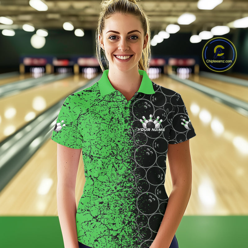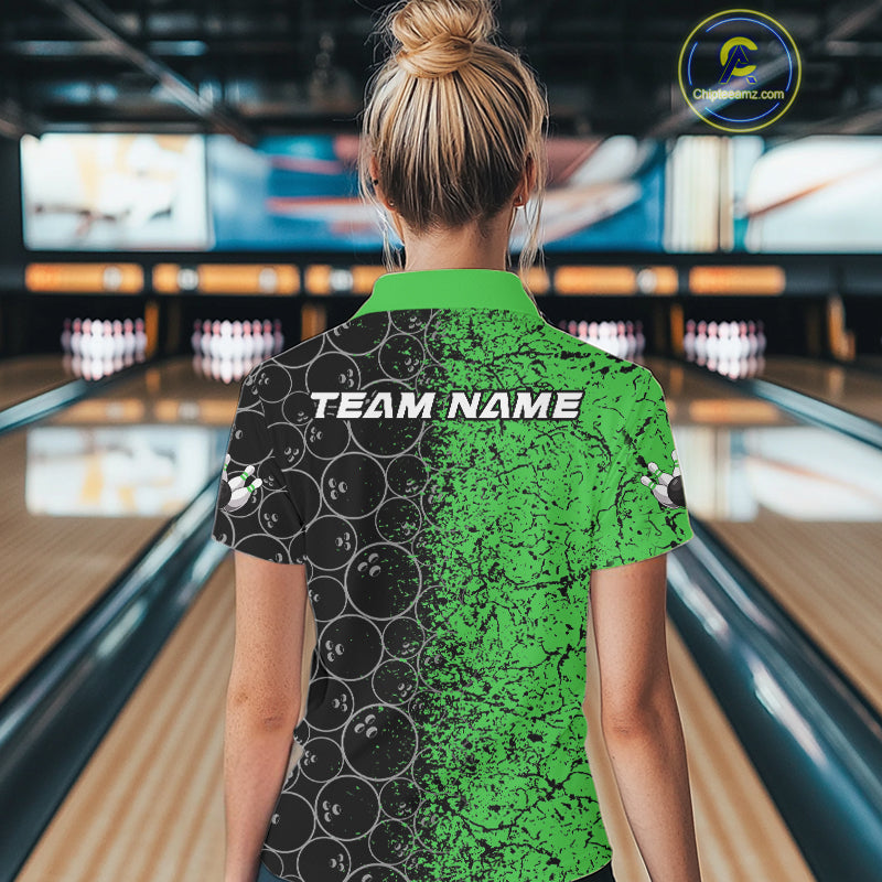 Custom Black And Green Splatter Bowling Ball Pattern Bowling Team Polo Shirts For Women IPHW9792