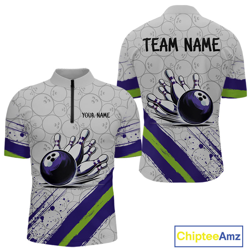 Purple and Green Bowling Camo Polo, 1/4 Zip Shirt for Men Custom Team bowling jersey gift for bowlers NQS10008