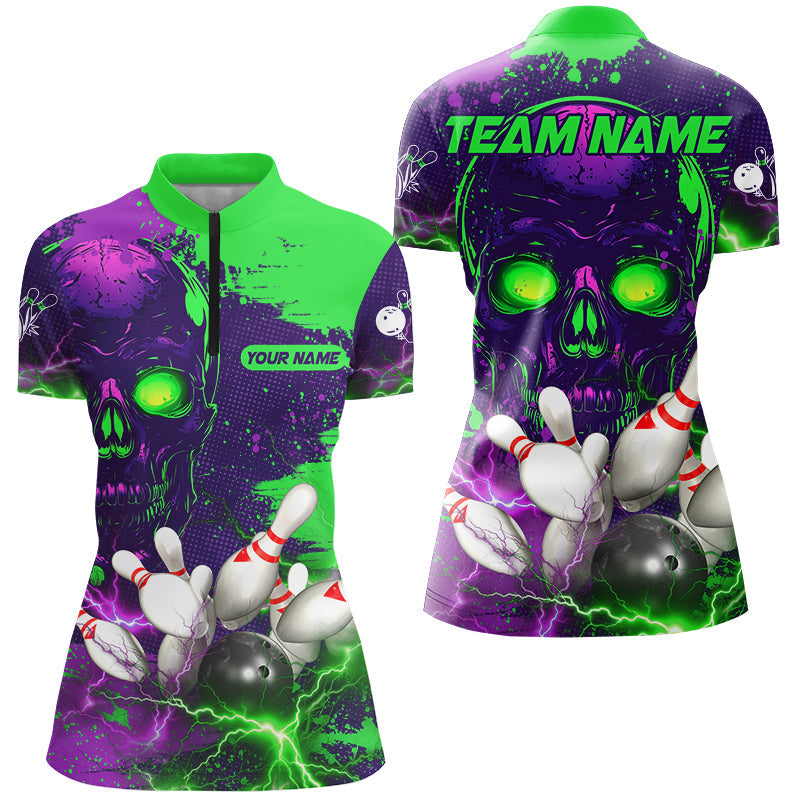 Purple and Green Lightning Thunder Storm Skull Bowling Shirts For Women Custom Bowling Team Jerseys NQS8598