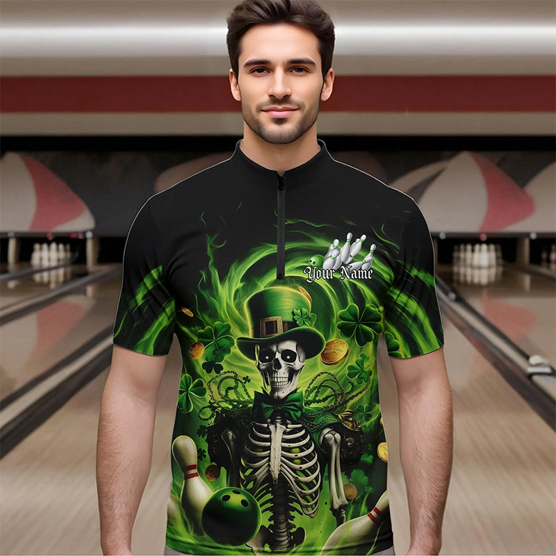 Custom Green St Patricks Day Skull Bowling Quarter-Zip Shirts For Men, Shamrock Bowling Shirt IPHW8376