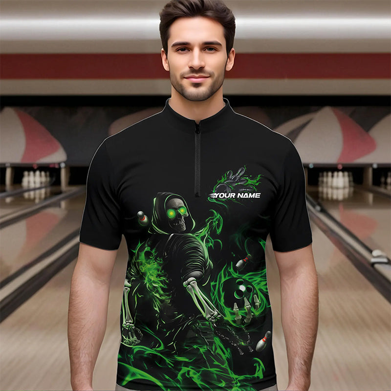 Custom Black And Green Flame Skeleton Bowling Quarter-Zip Shirts For Men, Skull Bowling Jerseys IPHW8413