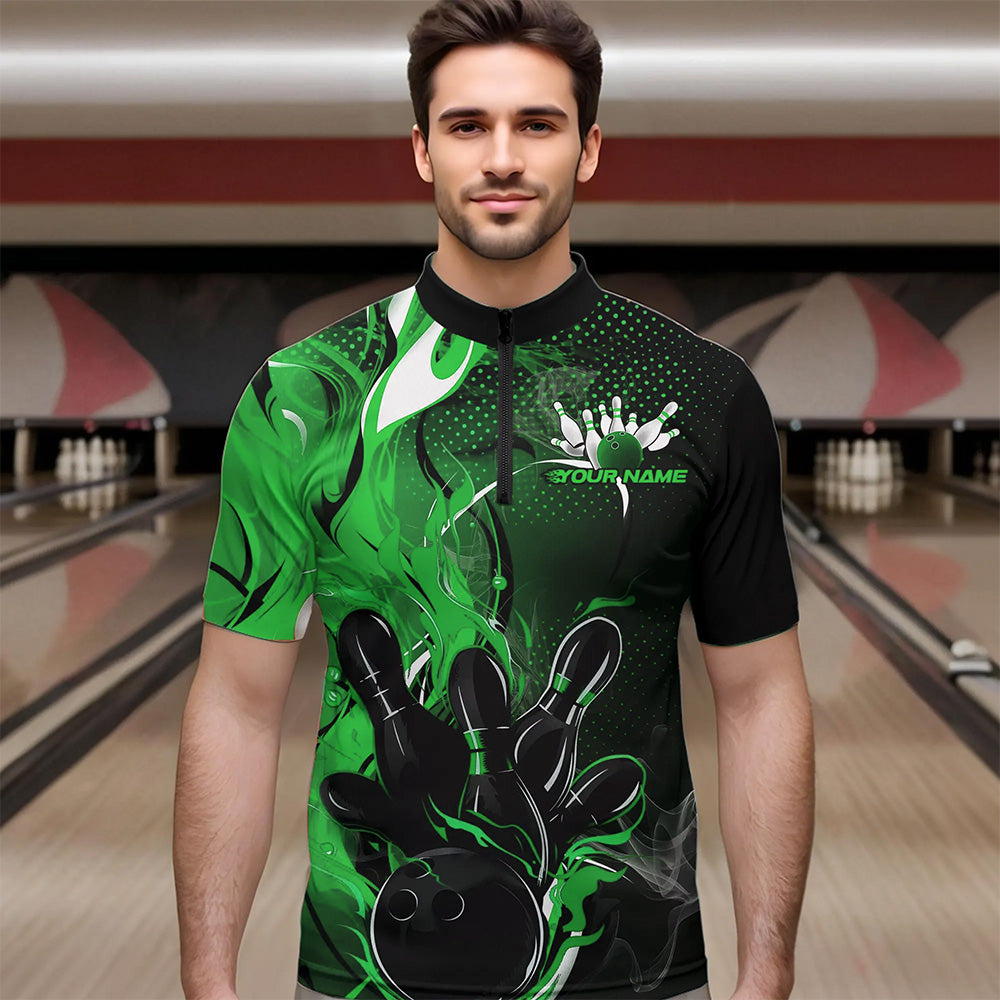 Black And Green Custom Flame Bowling Quarter-Zip Shirts For Men, Fire Bowling League Team Shirt IPHW8632