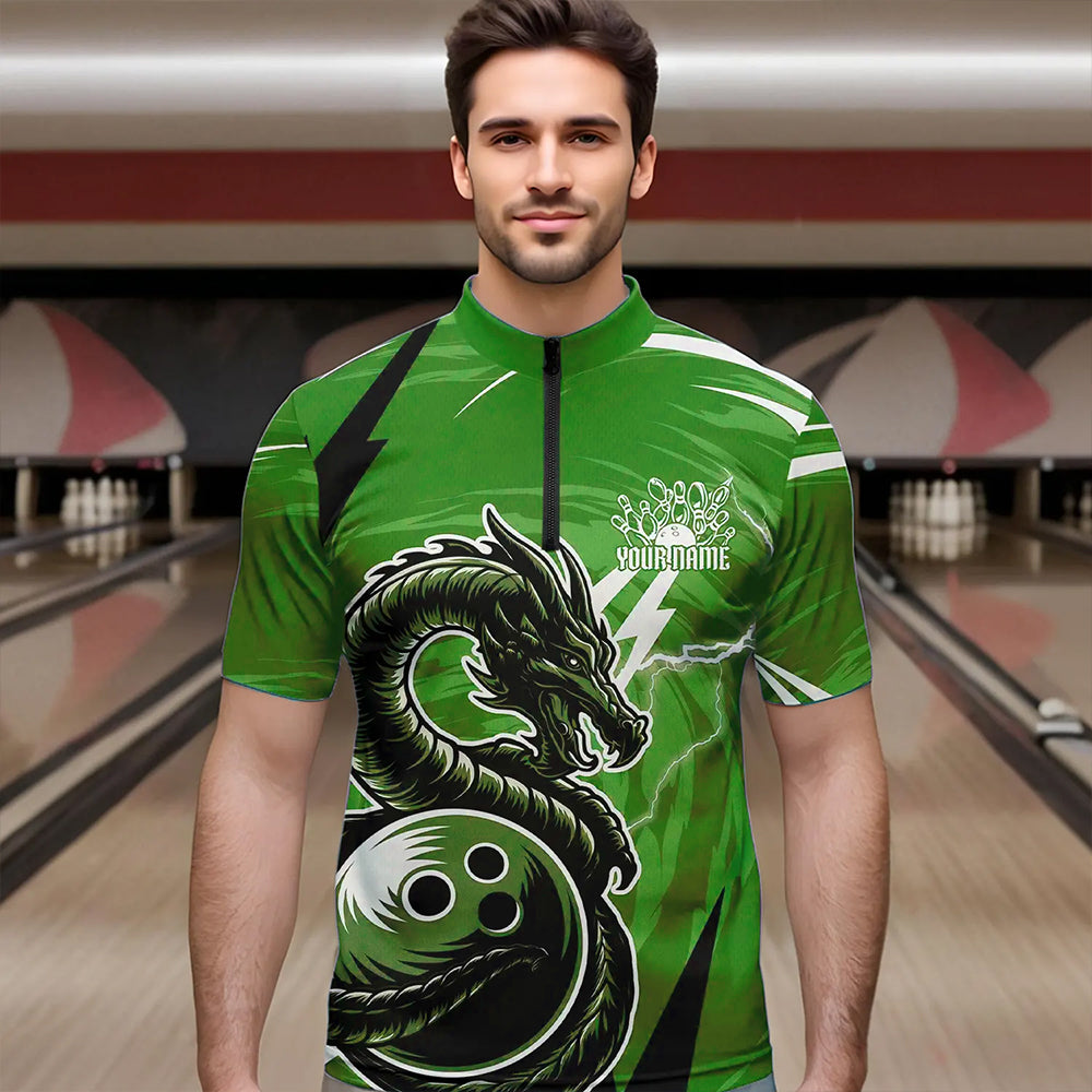 Custom Black And Green Thunder Lightning Dragon Bowling Jerseys Bowling Quarter-Zip Shirts For Men IPHW8660