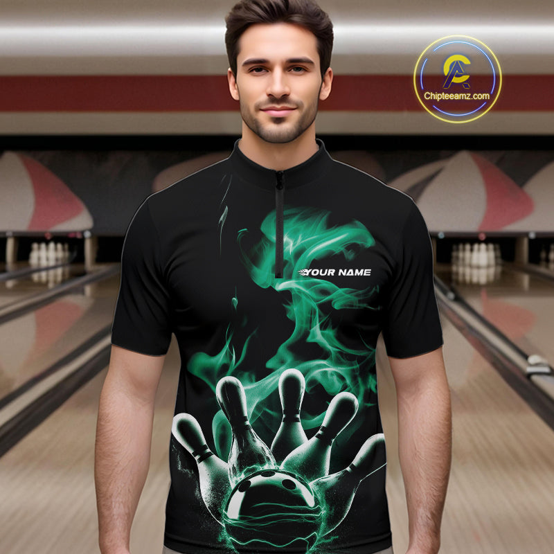 Custom Green Smoke Bowling Quarter-Zip Team Shirts For Men, Flame Bowling League Shirt IPHW9566