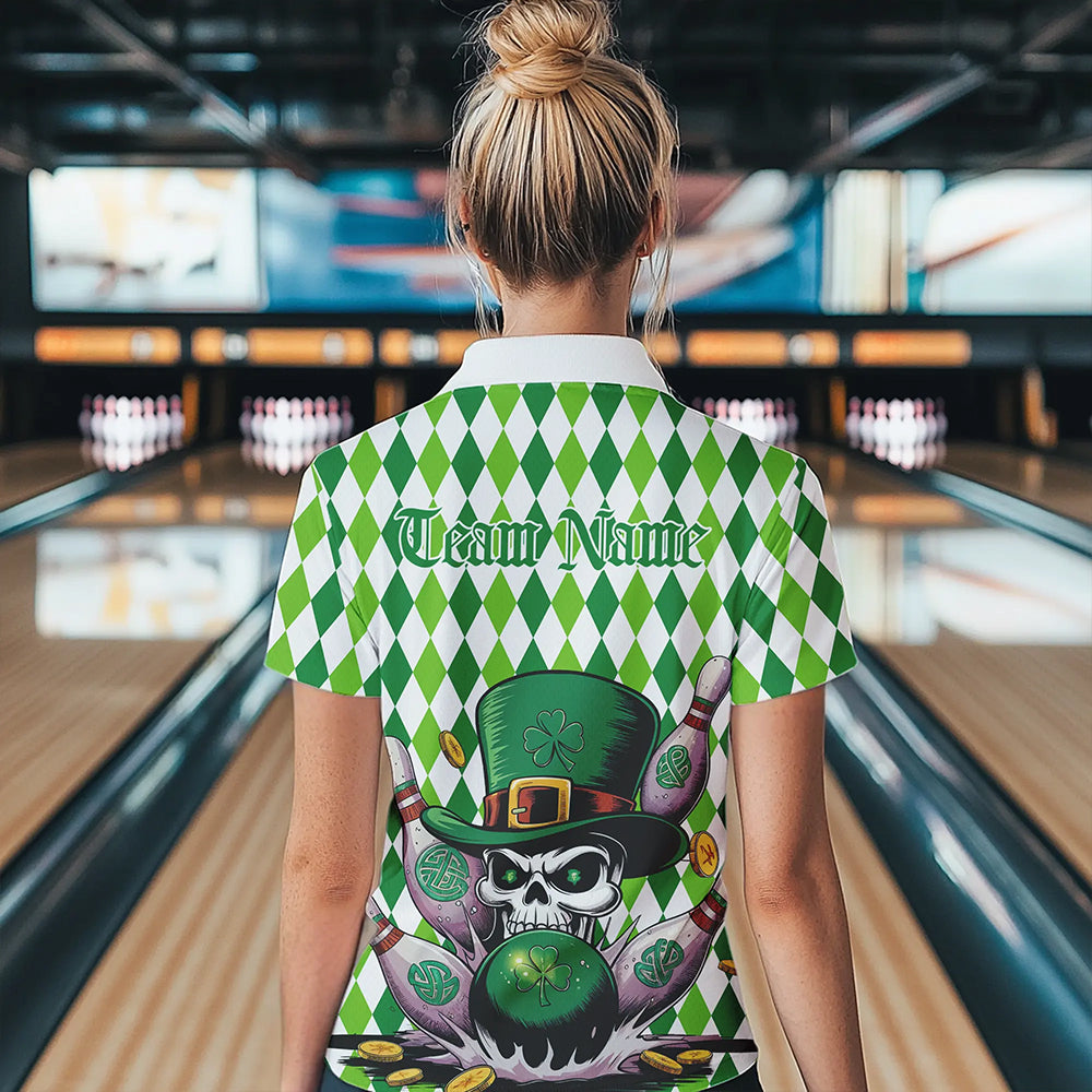 Custom White And Green St Patricks Argyle Skull Bowling Womens Quarter-Zip Shirts Jerseys IPHW8596