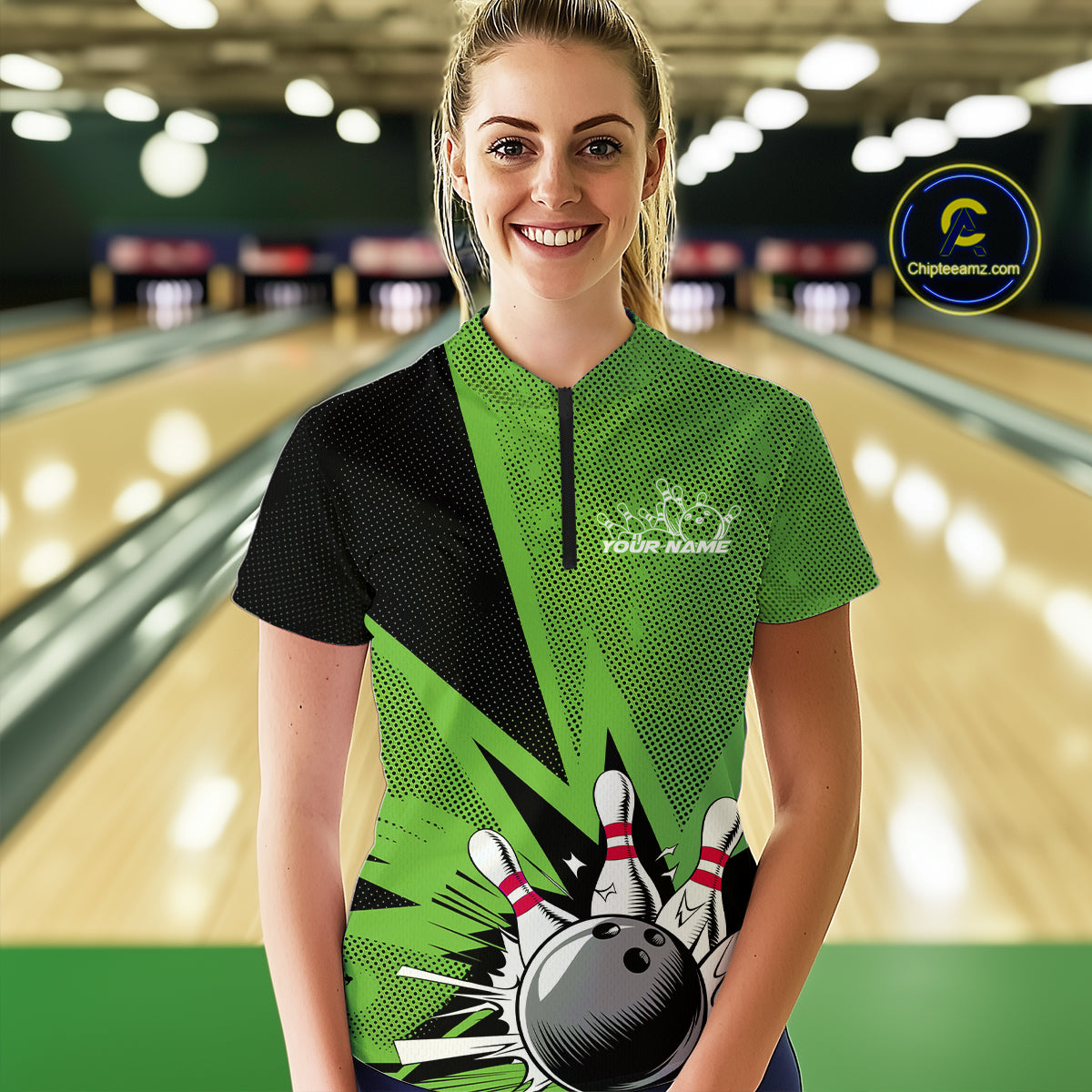 Custom Green Bowling Jerseys, Bowling Team Women Quarter-Zip Shirts Bowling League Shirt IPHW9392