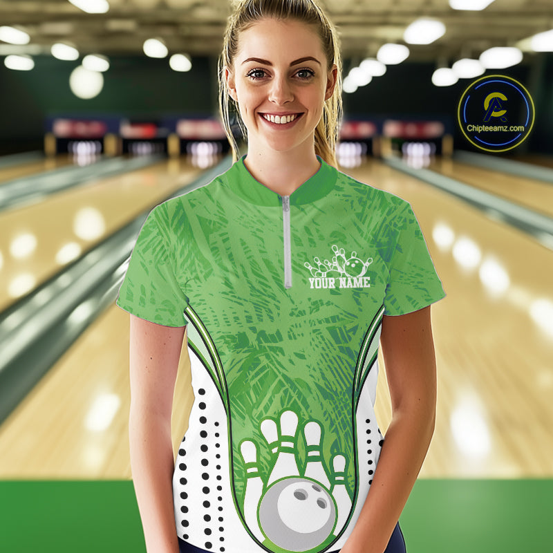 Custom Green Camo Bowling Team Women Quarter-Zip Shirts, Bowling Jerseys Bowler Outfit IPHW9597