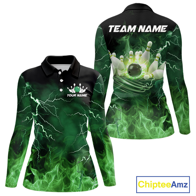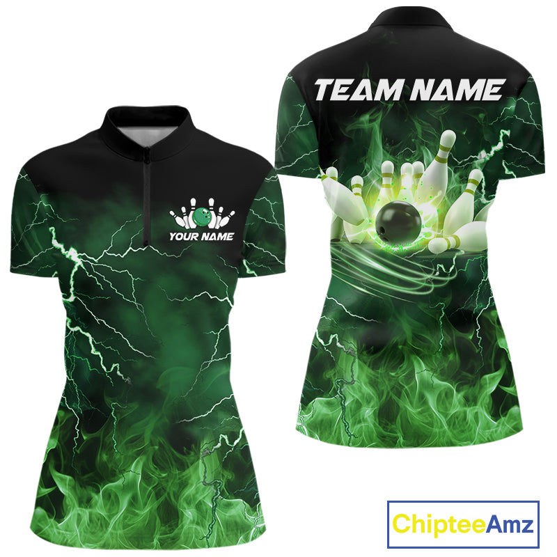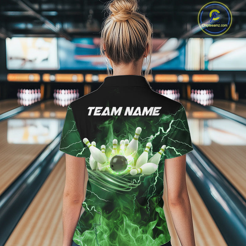 Women bowling shirts Custom green lightning thunder flame Bowling Team Jersey, gift for team Bowlers NQS10388
