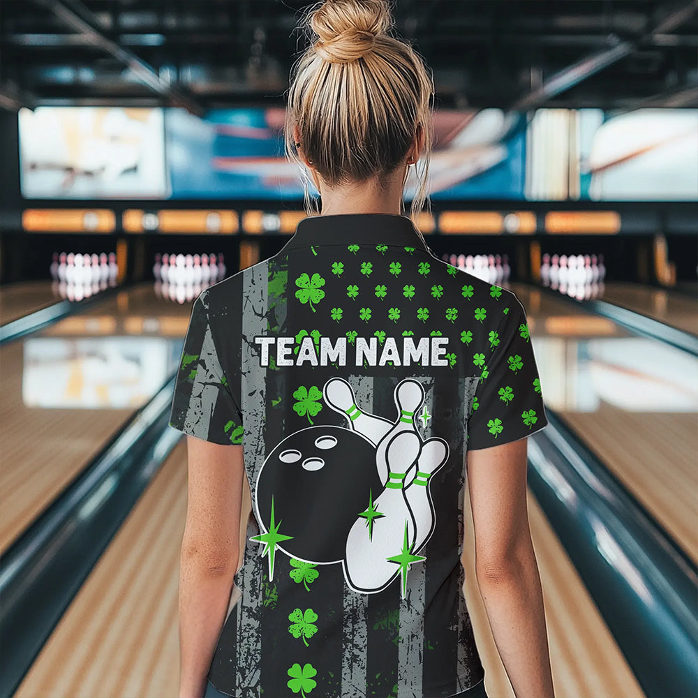 Green Shamrock Grunge US Flag Patriotic Bowling Shirts For Women Custom St Patrick Day Bowling Jersey TDM3545