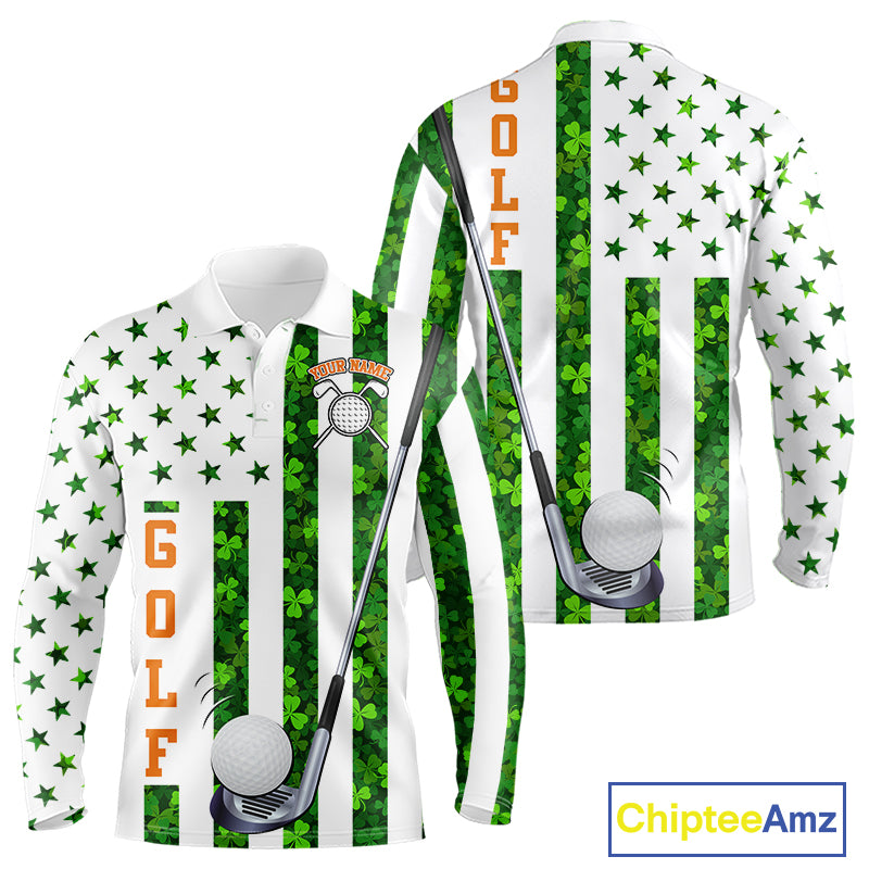 White, Green and Orange shamrock American Flag Mens Golf polo shirts Custom St Patrick golf outfit NQS11297