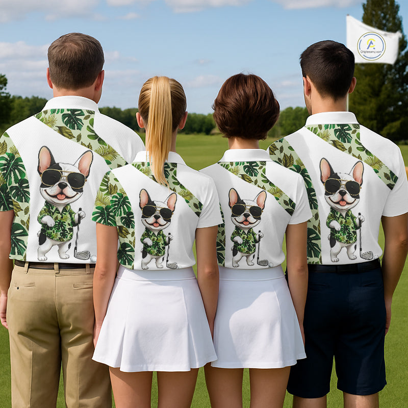 Green Tropical Pattern Mens Golf Polo Shirts Custom Cute Bulldog Golf Tops, White Golf Outfit For Men NHN0067