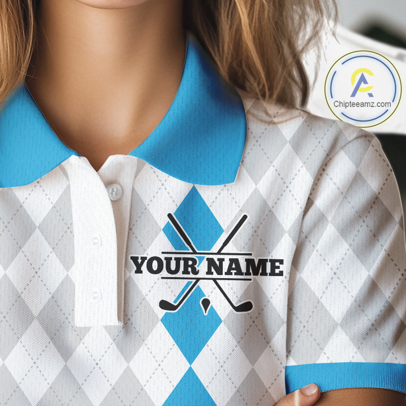 Custom Blue and White argyle pattern Golf Polo Shirts For Women, personalized team ladies golf outfit NQS11210