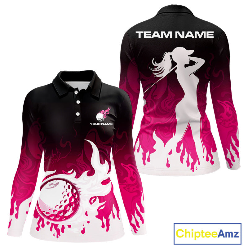 Pink Womens Golf Polo Shirts Custom Name Pink Flame Golf Ball Long Sleeve Shirt For Women Personalized NHN0039