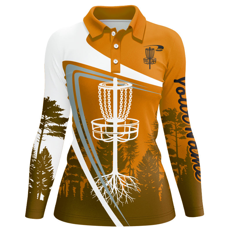 Womens disc golf polo shirt custom name orange disc golf basket, personalized disc golf shirts NQS8682