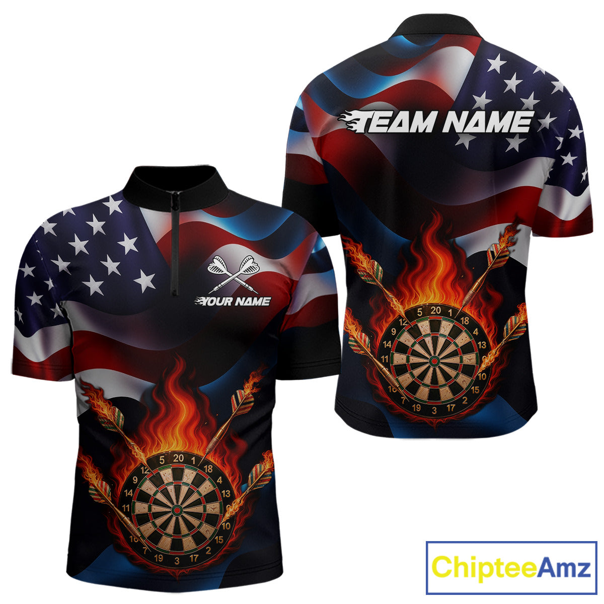 Personalized Flaming Dartboard American Flag Darts Shirt For Men Custom Patriotic Dart Team Jersey TDM4682