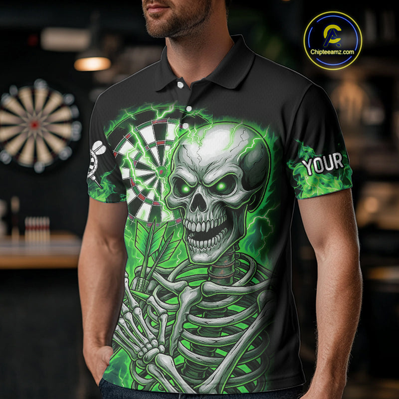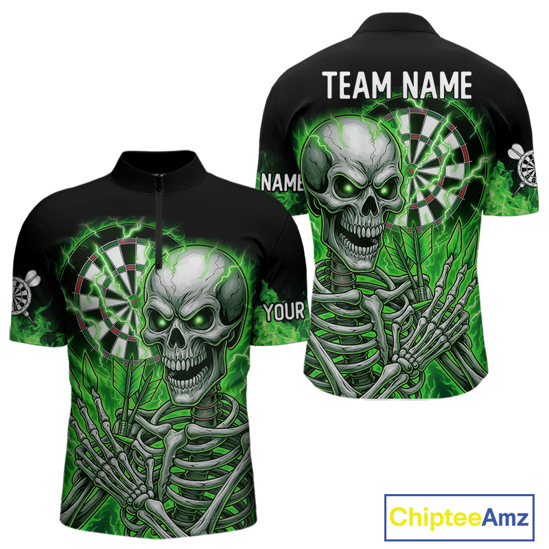 Green Flaming Lightning Skeleton Darts Shirt For Men Custom Skull Dart Jersey Team Polo & 1/4 Zip TDM4740