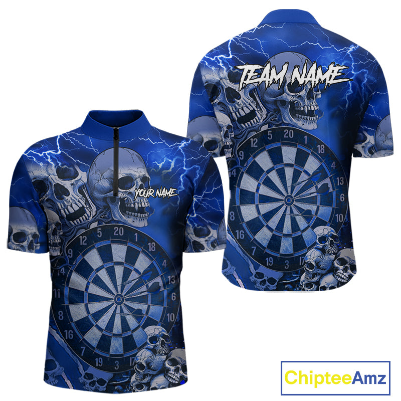 Blue Funny Skull Lightning Darts Shirt For Men Custom Darts Team Jersey Polo & Quarter Zip TDM4980