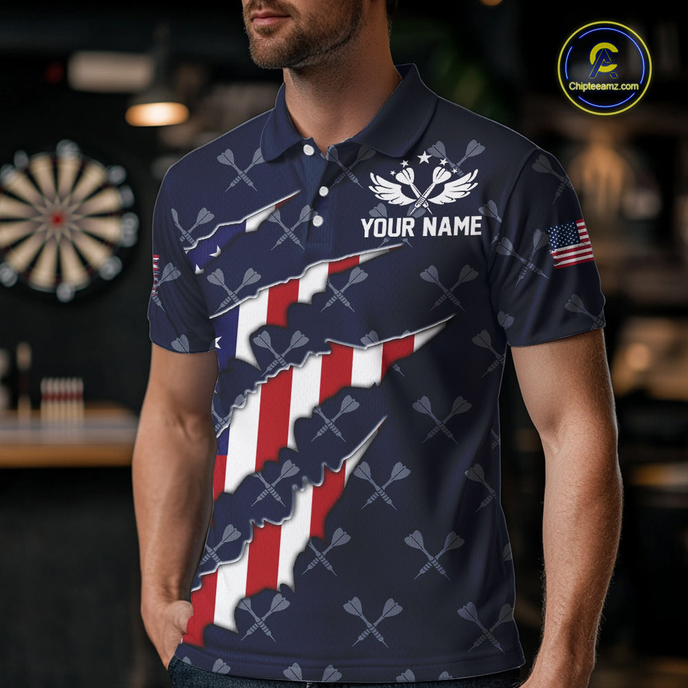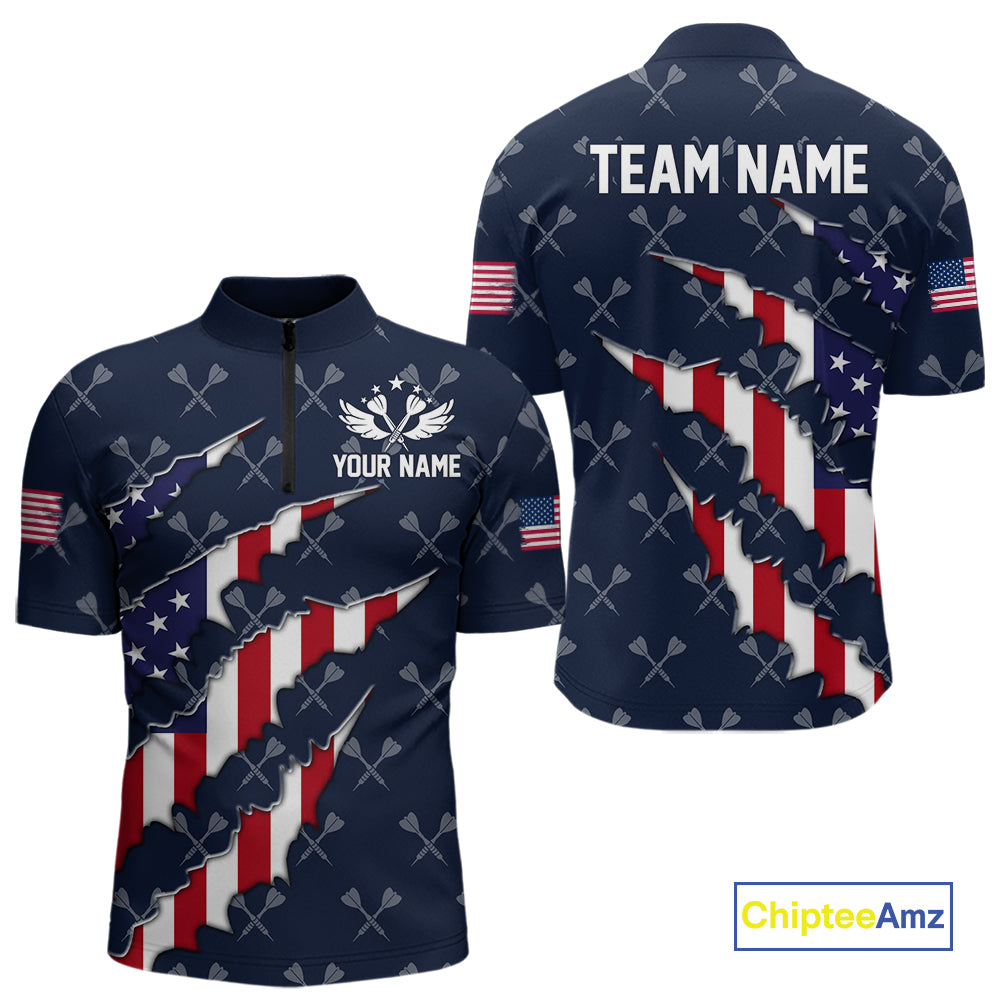 Personalized American Flag Navy Dart Pattern Polo & Quarter Zip For Men, Patriotic Darts Jersey TDM4996