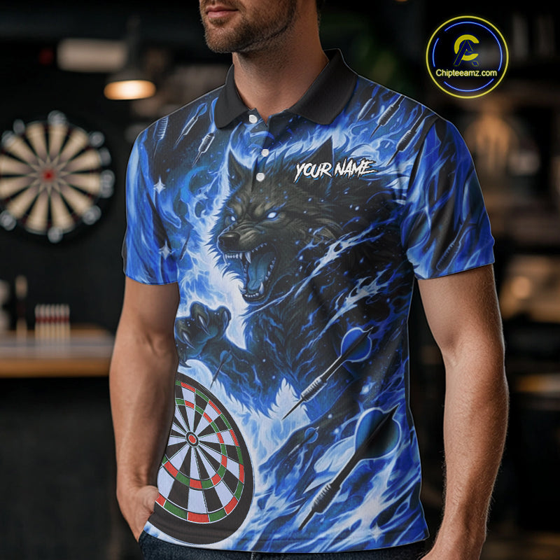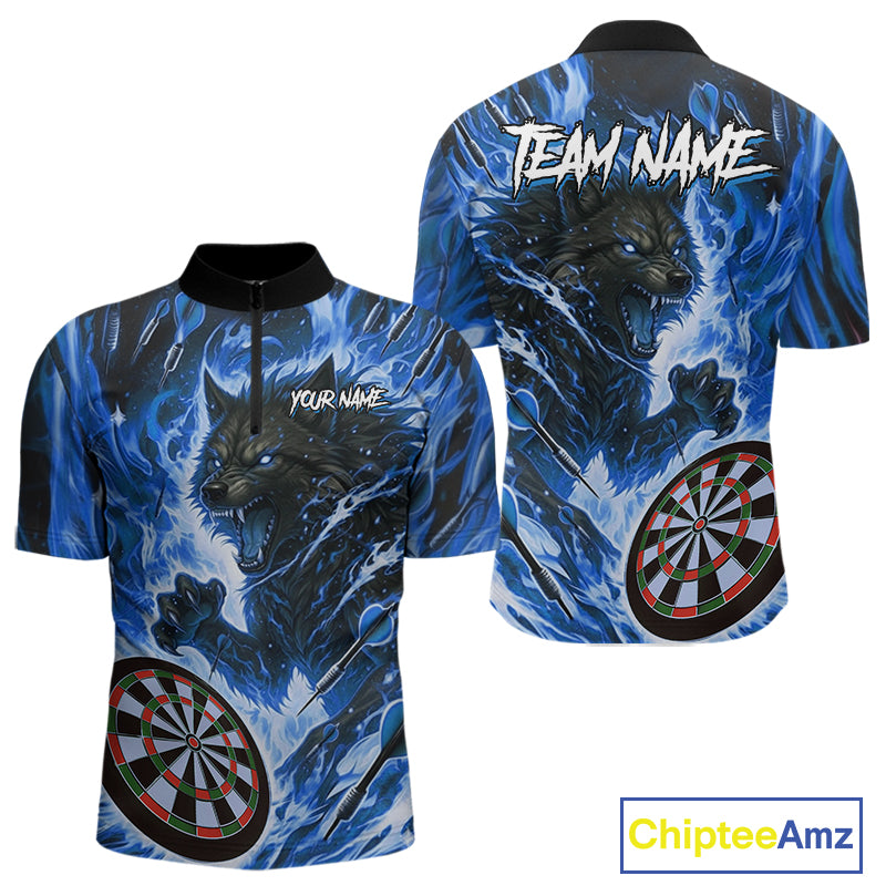 Blue Flaming Wolf Dartboard Jersey For Men Custom Darts League Team Shirt Polo & Quarter Zip TDM5023