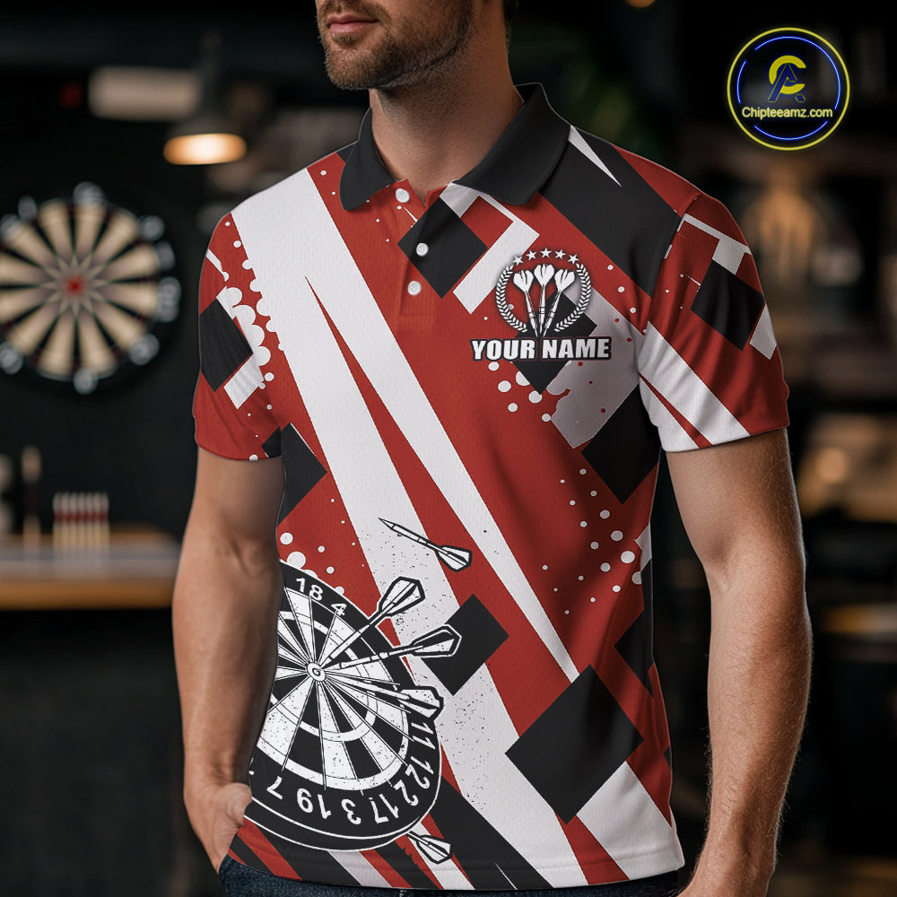 Custom Red Geometric Darts Polo & Quarter Zip For Men, Personalized Darts Team Jersey Outfit TDM5026