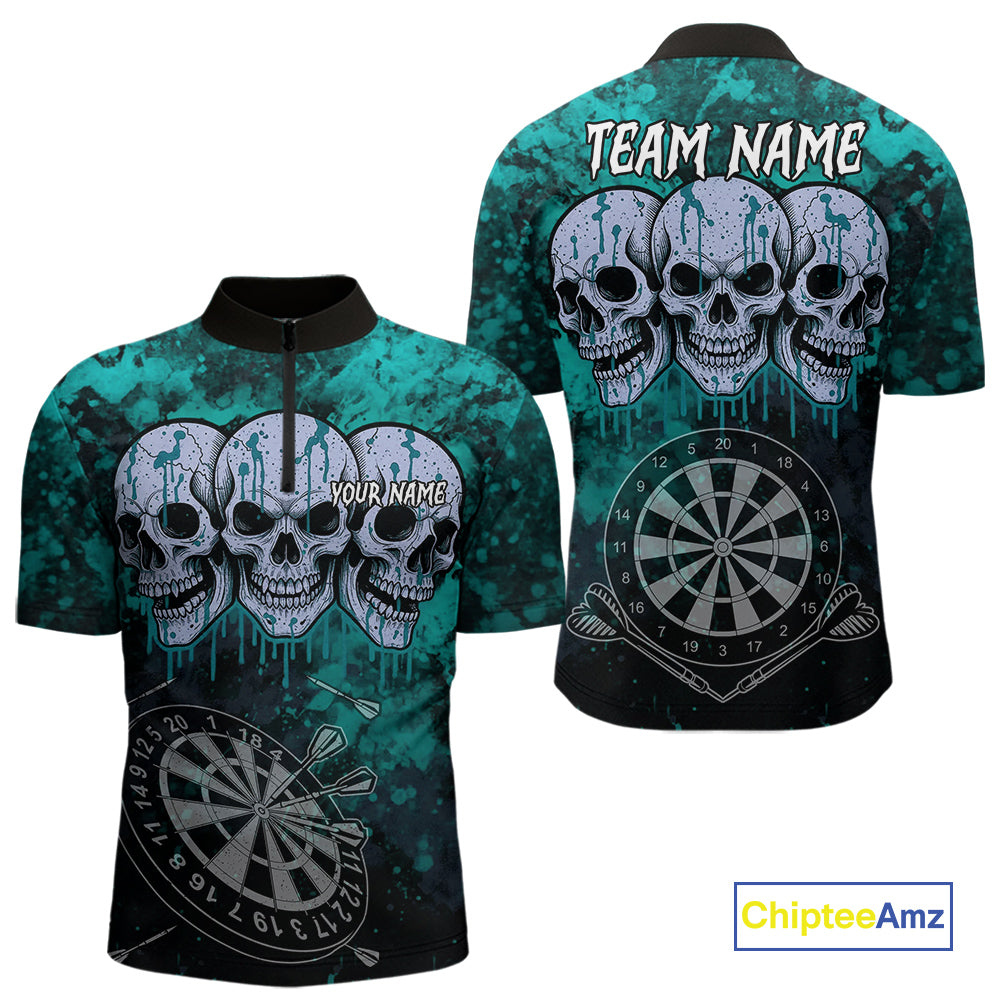 Black And Turquoise Grunge Skull Mens Dart Shirts Custom Dart Jerseys Team Polo & Quarter Zip TDM5129