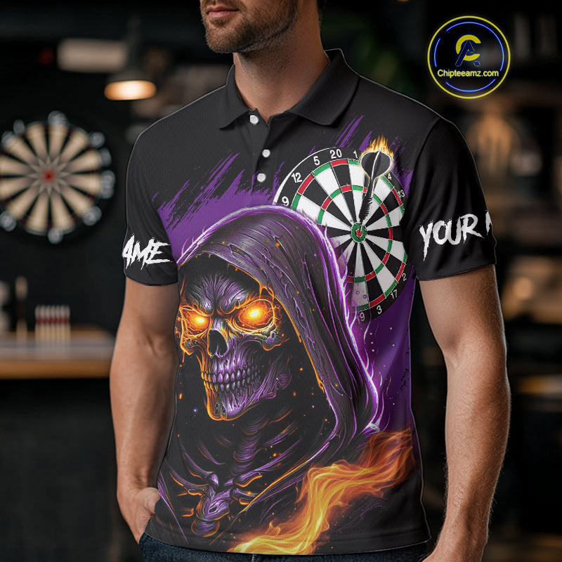 Personalized Purple Death Skeleton Fire Dart Shirt For Men Custom Skull Dart Jersey Polo & 1/4 Zip TDM4893