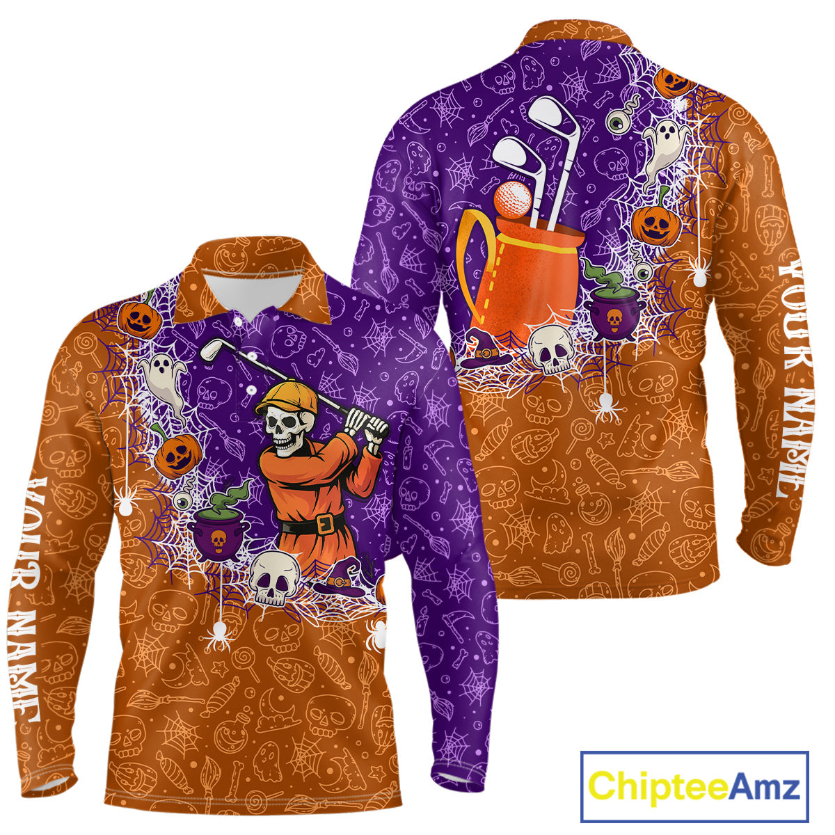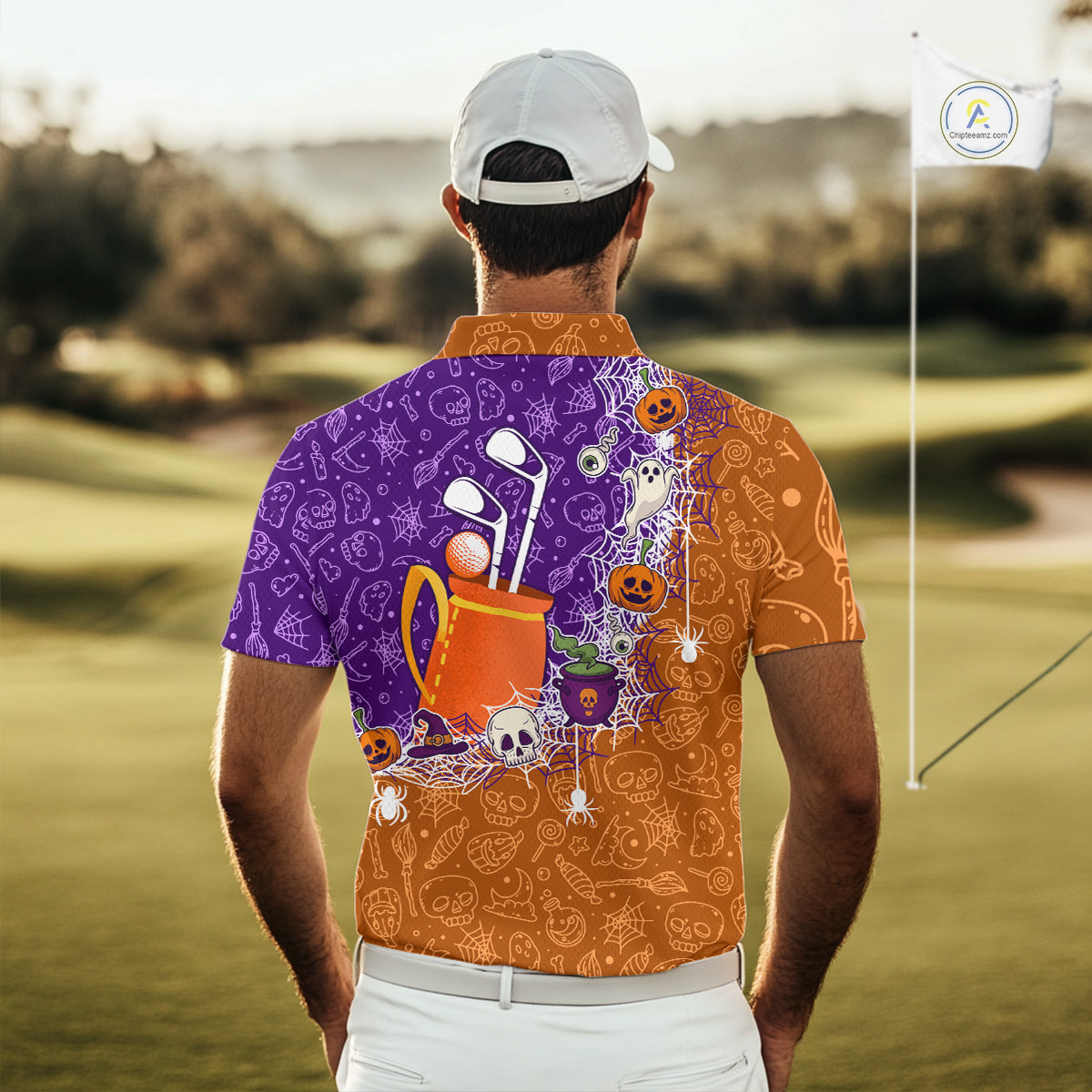 Halloween Skull Playing Golf Mens Golf Polo Shirt Custom Halloween golf outfit For Men Golf Gifts NQS10340
