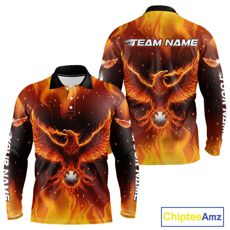 Mens Long Sleeve Golf Polo Shirts Custom Phoenix Red Flame Team Golf Tops, White Golf Outfit For Men NHN0077